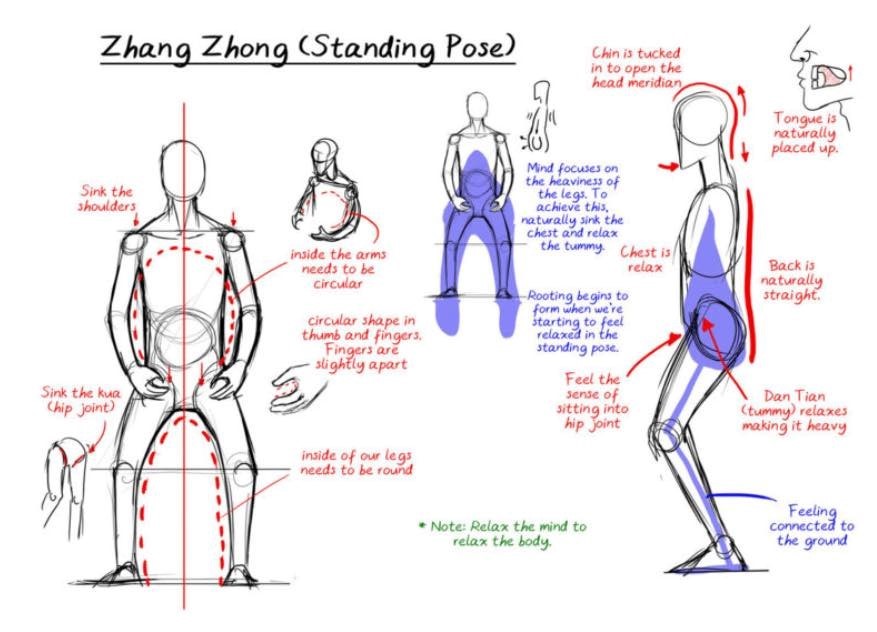 Počítajte, prosím s tým, že hoci stáť sa môže zdať tou najjednoduchšou vecou na svete, nie je to celkom tak a táto meditácia vyžaduje tréning. Skutočné uvoľnenie a pohoda počas státia prídu až po niekoľkých týždňoch - a až keď sa v postoji naozaj uvoľníme, začne proces budovania koreňov.